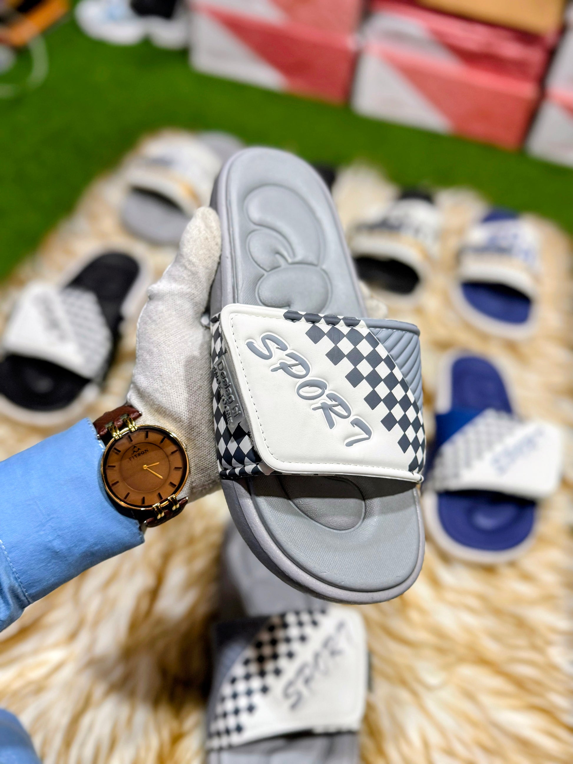 - Upper Strap: White strap with different color checkered design aur "SPORT" ka bold text likha hua.